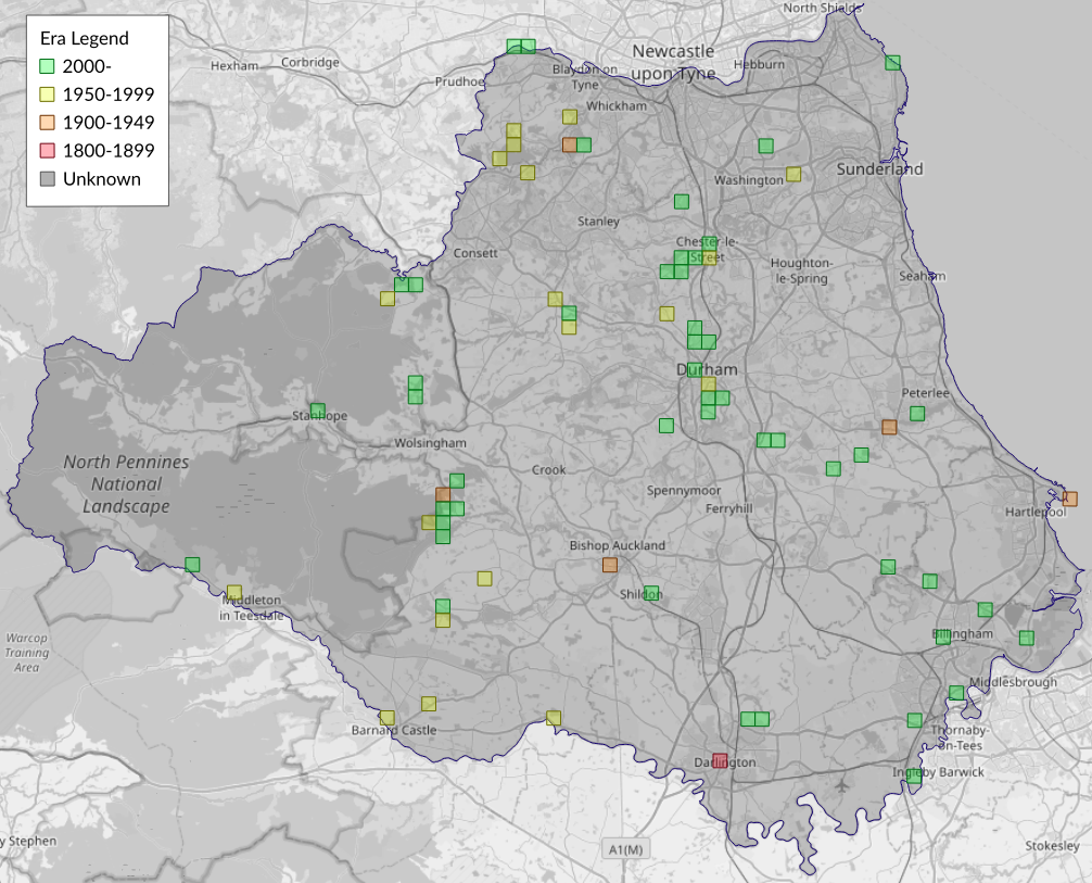 This map shows all records of Tawny-barred Angle - Macaria liturata in the Durham (VC66) database per monad (1km grid square). The map can be explored further by zooming and panning, can be reset using the button on the left, and can be filtered by selecting the era. Click on a monad to view a full list of species recorded in it, or its containing hexad (10km grid square).