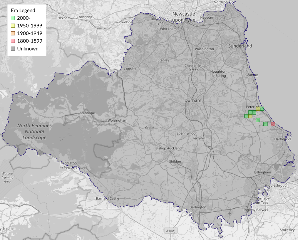 This map shows all records of Blomer's Rivulet - Venusia blomeri in the Durham (VC66) database per monad (1km grid square). The map can be explored further by zooming and panning, can be reset using the button on the left, and can be filtered by selecting the era. Click on a monad to view a full list of species recorded in it, or its containing hexad (10km grid square).