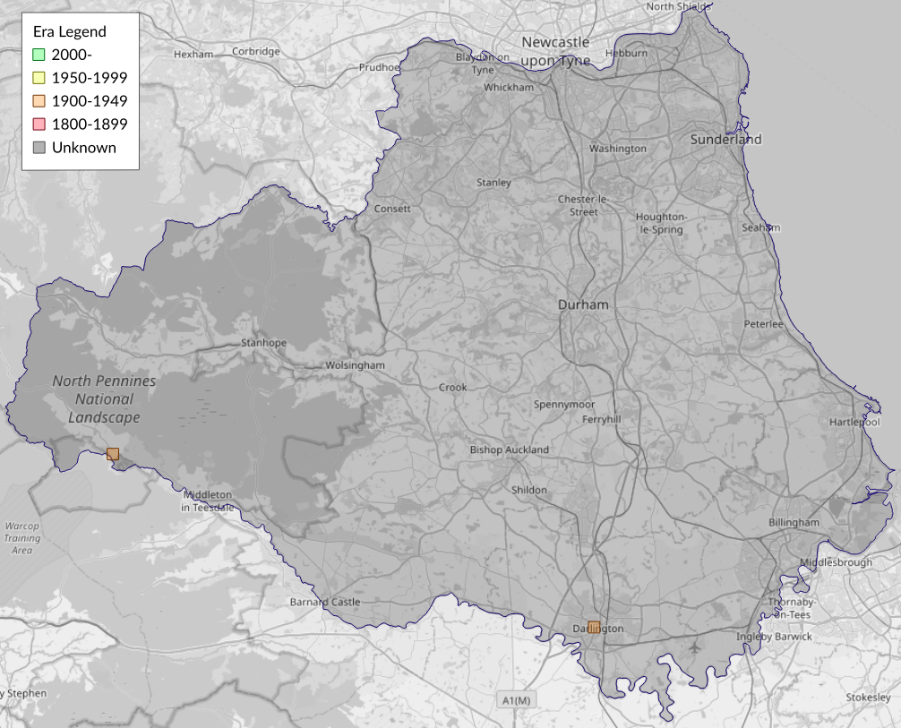 This map shows all records of - Callisto denticulella in the Durham (VC66) database per monad (1km grid square). The map can be explored further by zooming and panning, can be reset using the button on the left, and can be filtered by selecting the era. Click on a monad to view a full list of species recorded in it, or its containing hexad (10km grid square).