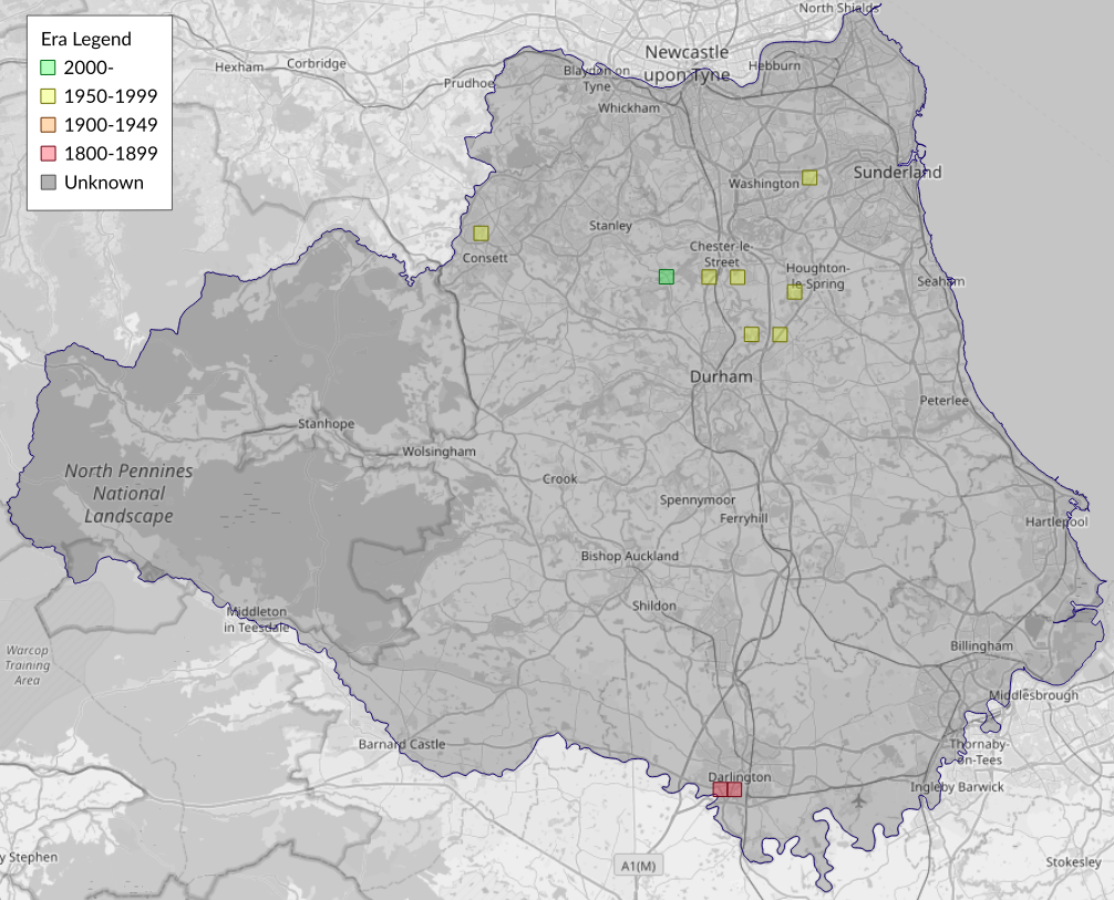 This map shows all records of - Stigmella regiella in the Durham (VC66) database per monad (1km grid square). The map can be explored further by zooming and panning, can be reset using the button on the left, and can be filtered by selecting the era. Click on a monad to view a full list of species recorded in it, or its containing hexad (10km grid square).