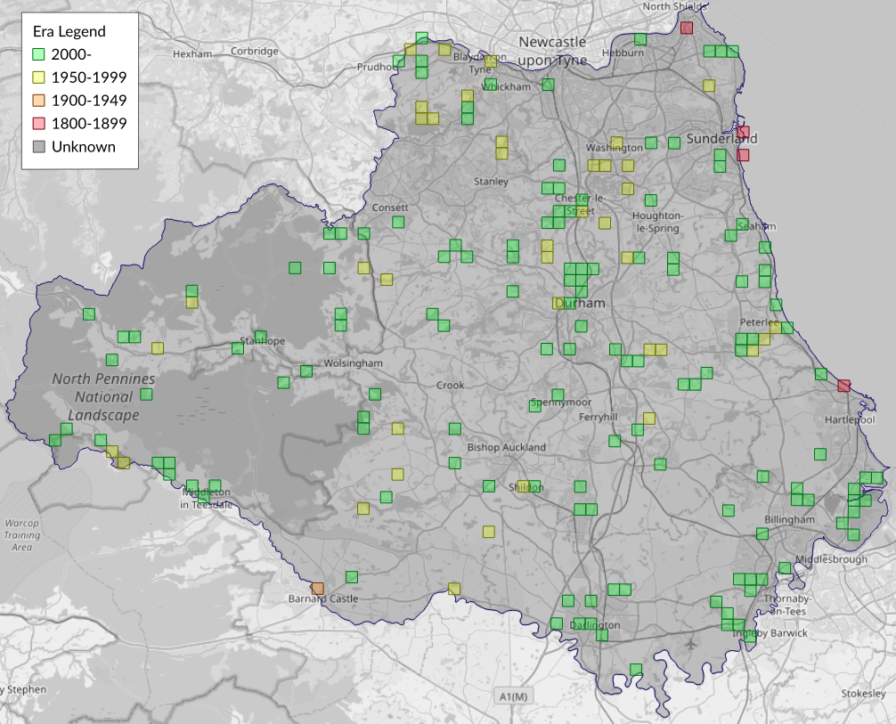 This map shows all records of Clouded-bordered Brindle - Apamea crenata in the Durham (VC66) database per monad (1km grid square). The map can be explored further by zooming and panning, can be reset using the button on the left, and can be filtered by selecting the era. Click on a monad to view a full list of species recorded in it, or its containing hexad (10km grid square).