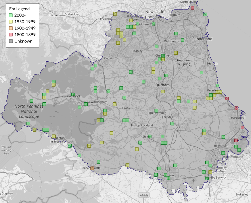 This map shows all records of Small Dotted Buff - Photedes minima in the Durham (VC66) database per monad (1km grid square). The map can be explored further by zooming and panning, can be reset using the button on the left, and can be filtered by selecting the era. Click on a monad to view a full list of species recorded in it, or its containing hexad (10km grid square).