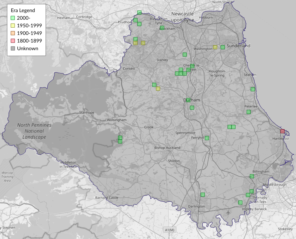 This map shows all records of Oak Nycteoline - Nycteola revayana in the Durham (VC66) database per monad (1km grid square). The map can be explored further by zooming and panning, can be reset using the button on the left, and can be filtered by selecting the era. Click on a monad to view a full list of species recorded in it, or its containing hexad (10km grid square).